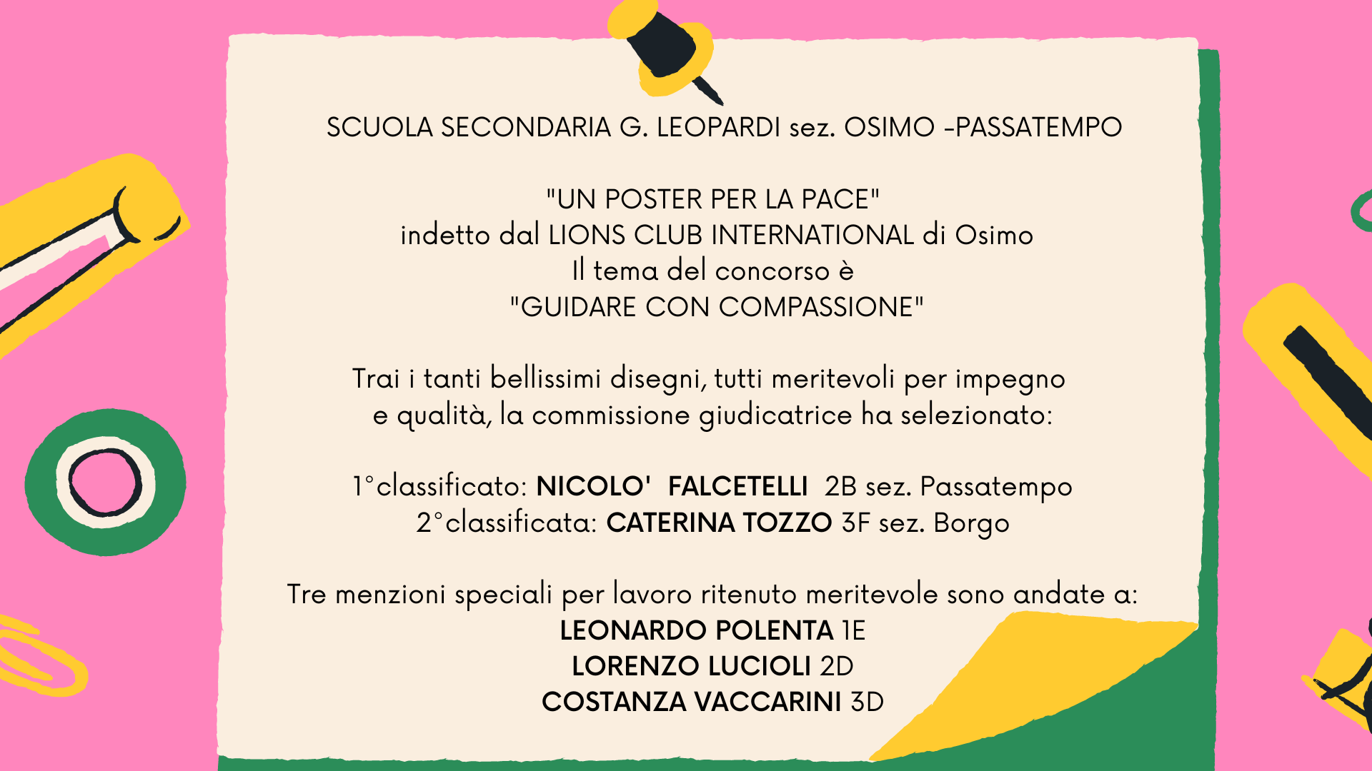 Dettagli Pubblicato: 30 Novembre 2022 Il nostro istituto ha partecipato al concorso "Un poster per la pace" con eccellenti risultati: guarda gli allegati Allegati: 1__CLASSIFICATO.png[ ]1394 kB 2CLASSIFICATA.png[ ]1099 kB MENZIONE1.png[ ]880 kB MENZIONE2.png[ ]1149 kB MENZIONE3.png[ ]733 kB CONCORSO_PACE_LIONS_CLUB (1).png[a.s. 2022-2023]234 kB